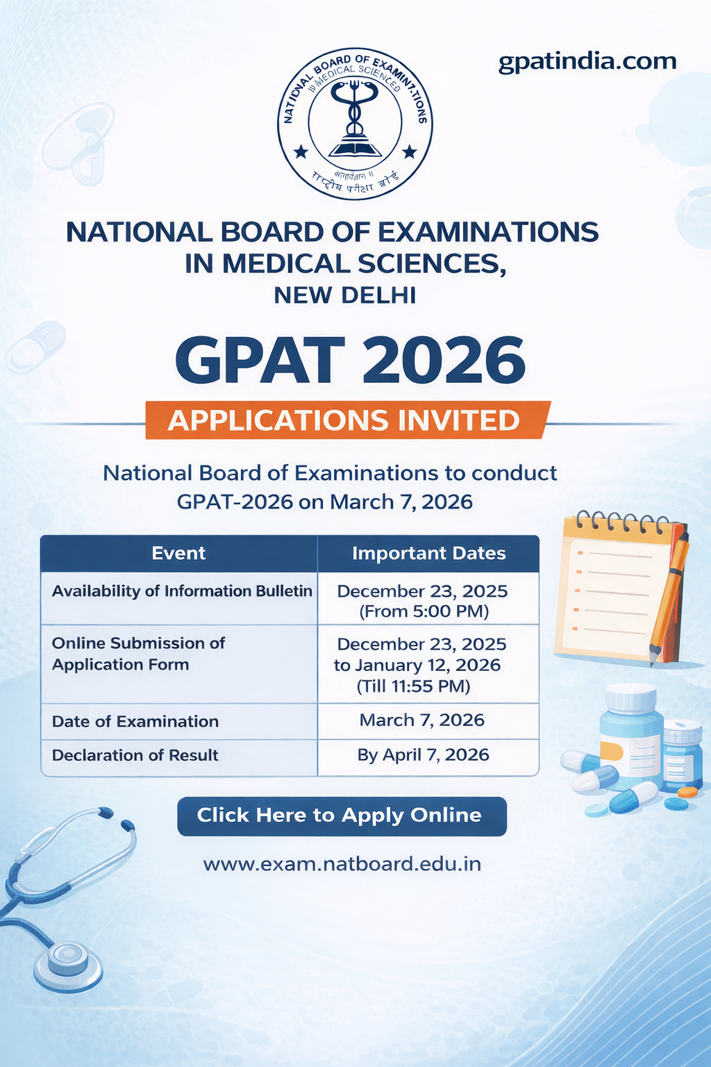 The National Board of Examinations in Medical Sciences (NBEMS), New Delhi has officially released the notification inviting applications for the Graduate Pharmacy Aptitude Test (GPAT) 2026. GPAT is a national-level entrance examination conducted for admission into MPharm programs and for eligibility for scholarships and fellowships in pharmacy education across India.